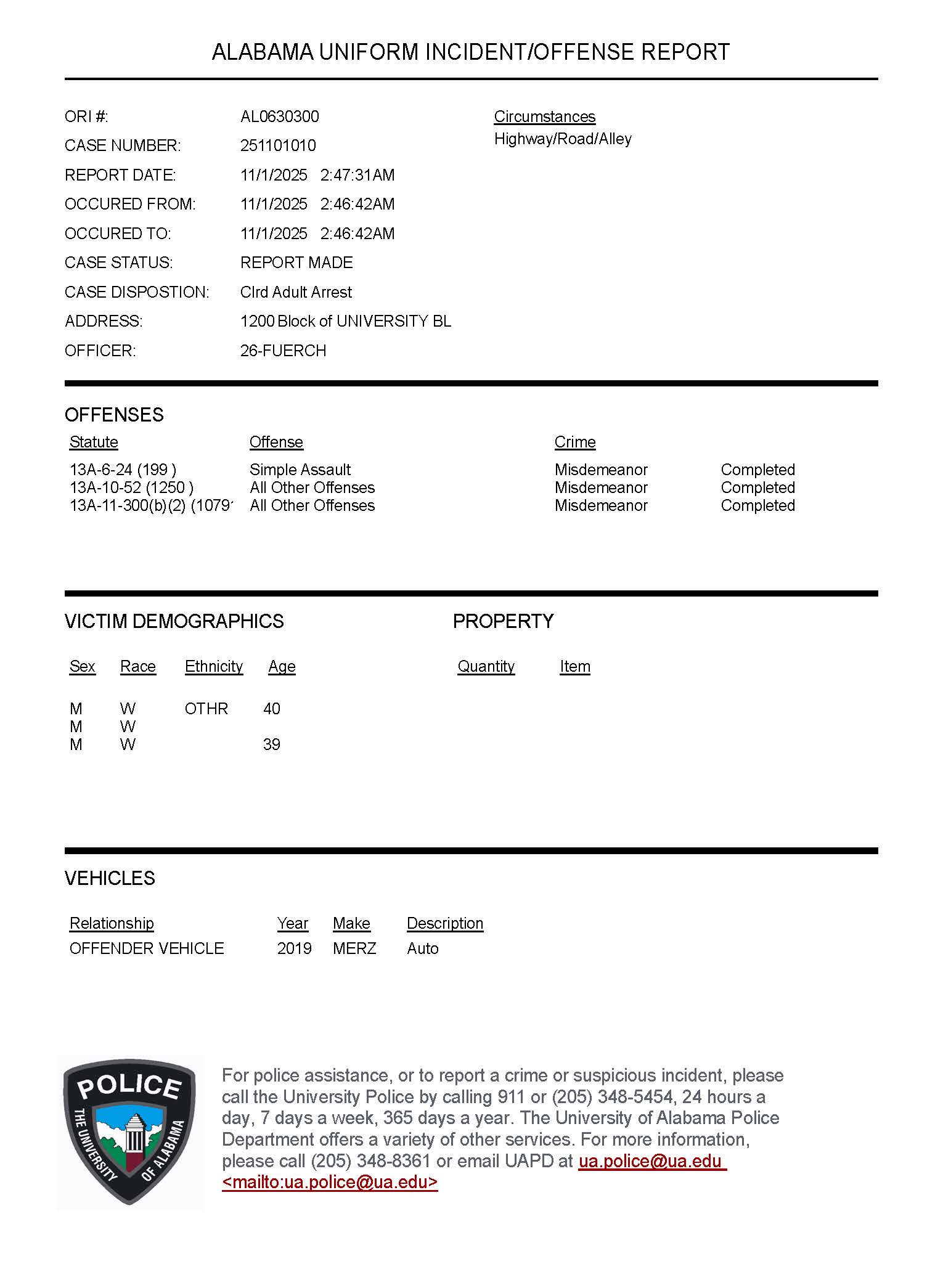 | R251018095 | Assault 3rd Degree | 10/18/25 1928 Hrs | 10/18/25 1928 Hrs | 10/18/25 2024 Hrs | 900 Block of Paul W. Bryant Drive Tuscaloosa, AL 35487 | Closed | Prosecution Declined | 20-Oct-25 | |