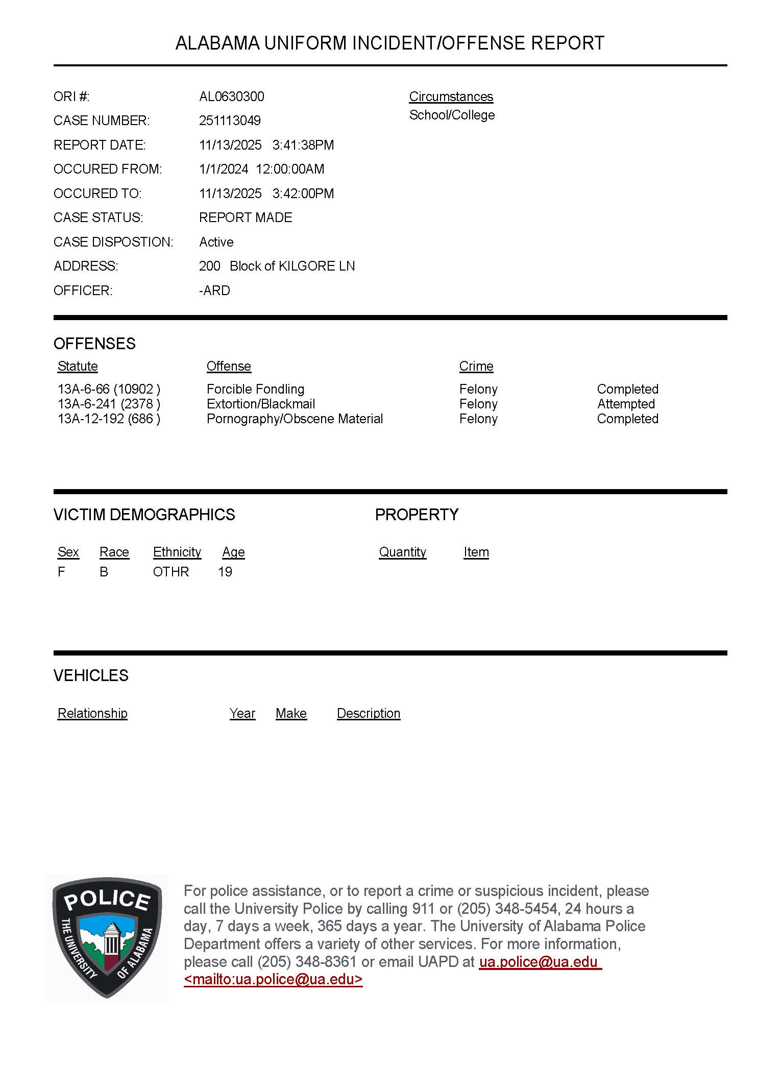 R251113006Harassment11/13/25 0131 Hrs11/13/25 0111 Hrs11/13/24 0115 Hrs700 Block of University Blvd. Tuscaloosa, AL 35487Pending13-Nov-25