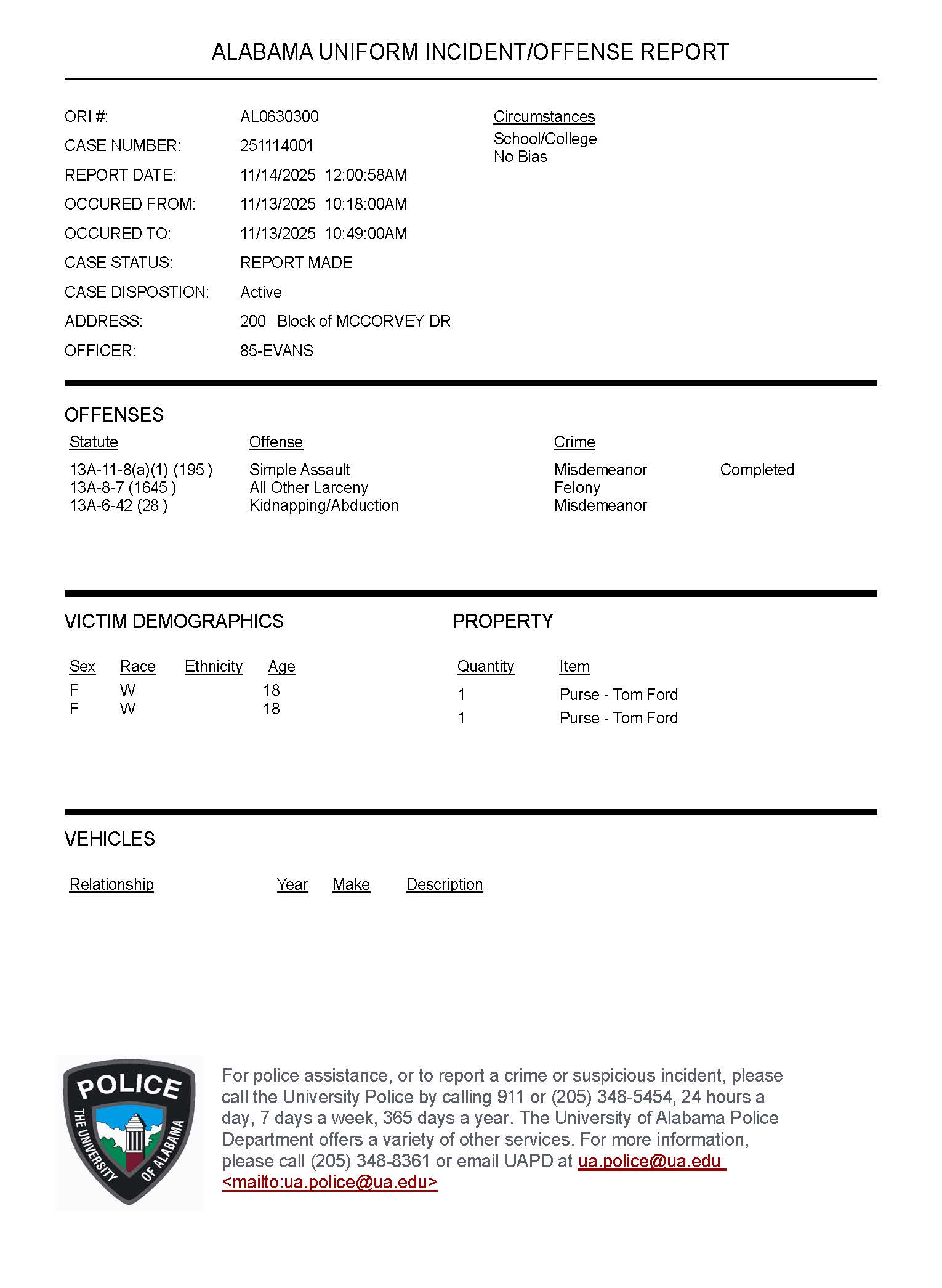 R251104003Theft of Property 4th Degree11/4/25 0130 Hrs11/3/25 0000 Hrs11/3/25 0100 Hrs200 Block of McCorvey Drive Tuscaloosa, AL 35487Pending11/13/25Inactive 4-Nov-25