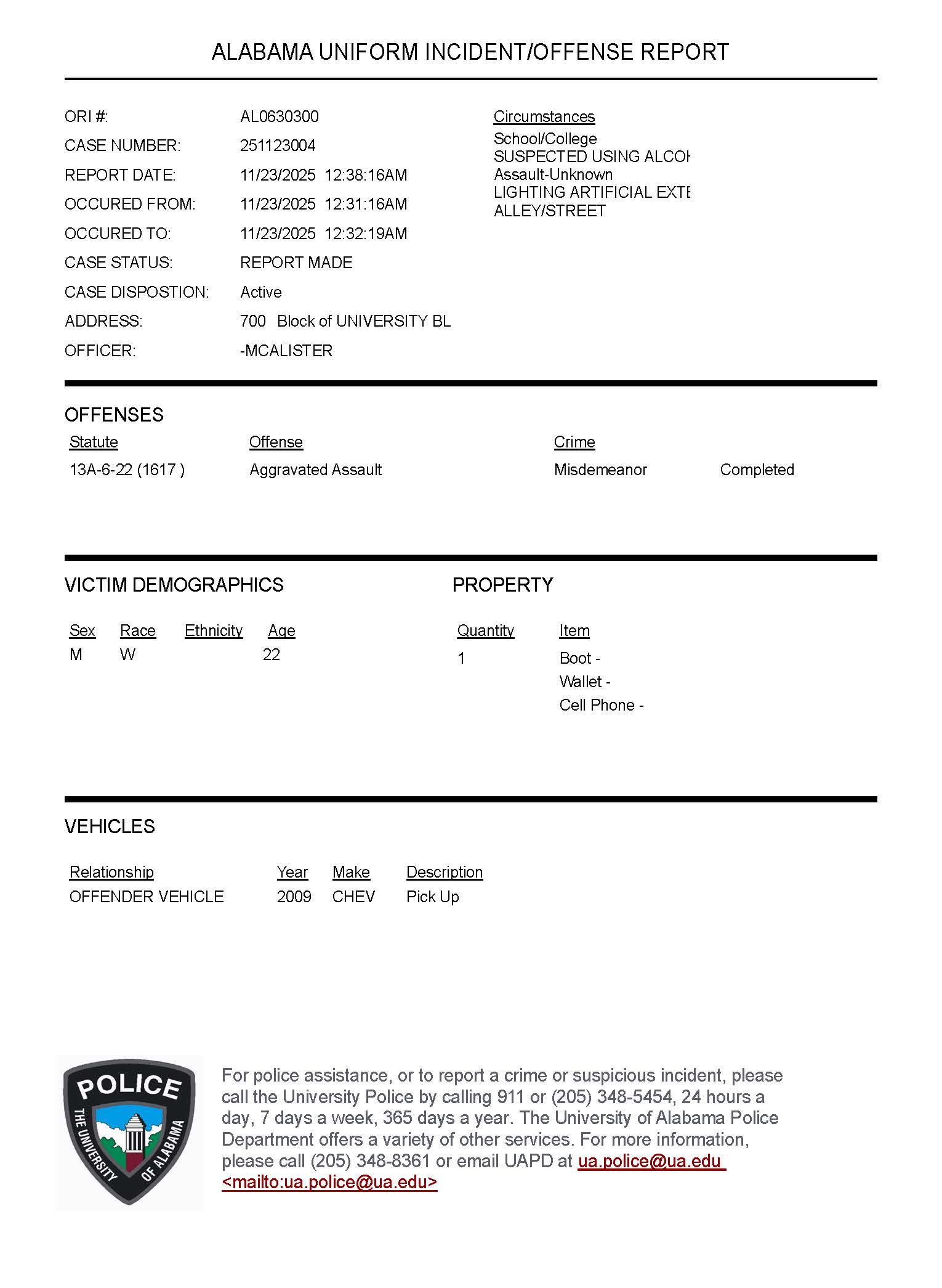 R251123004Assault 3rd Degree11/23/25 0038 Hrs11/23/25 0031 Hrs11/23/25 0032 Hrs700 Block of University Blvd. Tuscaloosa, AL 35487Pending24-Nov-25