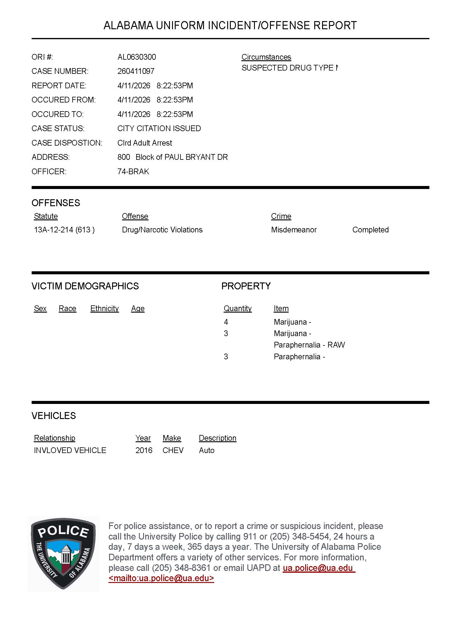 | R260403067 | Unlawful Possession of Marijuana 2nd Degree | 4/3/26 1950 Hrs | 4/3/26 1950 Hrs | 4/3/26 2033 Hrs | 1100 Block of University Blvd. Tuscaloosa, AL 35401 | Closed | Cleared by non-Custodial Adult Arrest | 6-Mar-26 | |