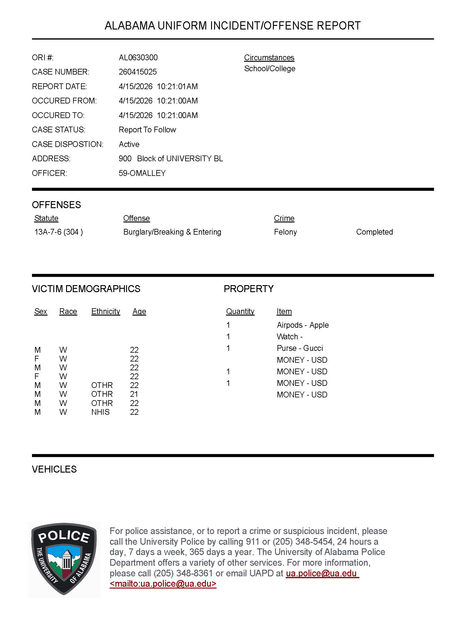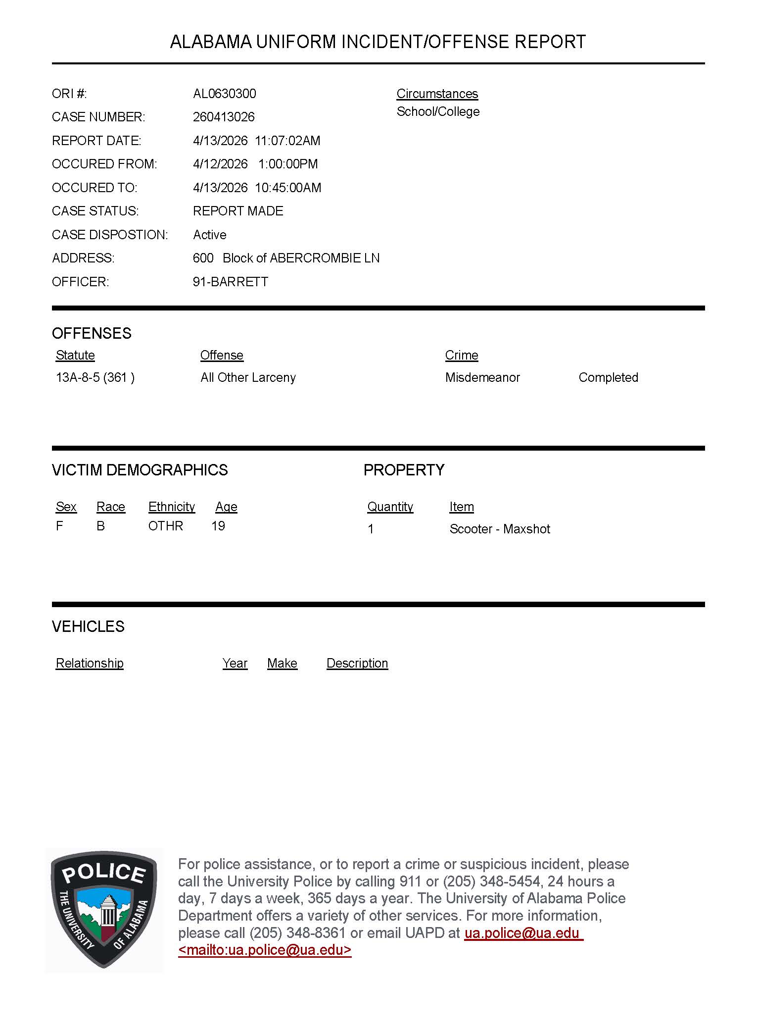 | R260410038 | Fraud (Theft of Property) | 4/10/26 1231 Hrs | 4/9/26 0500 Hrs | 4/9/26 0611 Hrs | 700 Block of Campus Drive West Tuscaloosa, AL 35487 | Pending | 13-Mar-26 |